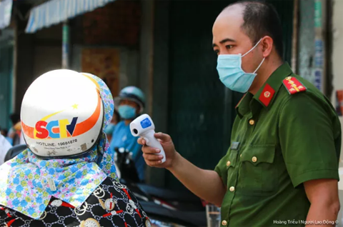 Lực lượng chức năng kiểm tra thân nhiệt tại một con hẻm trên đường Nguyễn Đình Chiểu, quân 3, TP HCM - Ảnh: Hoàng Triều