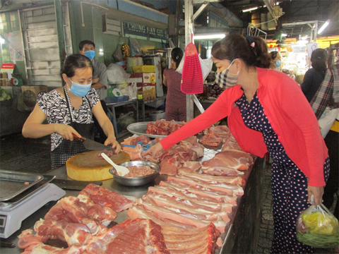 Tại TP HCM, do chợ truyền thống ngưng kinh doanh nhiều nên người tiêu dùng mua thịt heo ở kênh siêu thị, cửa hàng thực phẩm hoặc các cửa hàng chuyên thịt. Nhìn chung mặt hàng này do trữ được lâu nên không tăng giá nóng như rau xanh nhưng giữ giá cao. Theo bảng giá thịt heo của một người bán ở chung cư B. (phường An Khánh, TP Thủ Đức) thì thịt heo được đóng gói sạch trong túi zip, tiện cho mỗi lần mua với giá từ 150.000 đồng/kg (giò sống) đến 200.000 đồng/kg (sườn non), thịt nạc, đùi, cốt lết đồng giá 160.000 đồng/kg.