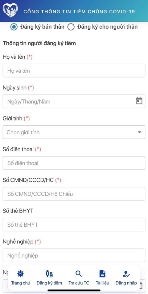 - Thông tin người đăng ký tiêm: Họ và tên, ngày sinh, giới tính, điện thoại, số CMND/CCCD/ hộ chiếu, số thẻ BHYT, nghề nghiệp, địa chỉ, quốc tịch, dân tộc và nhóm ưu tiên.