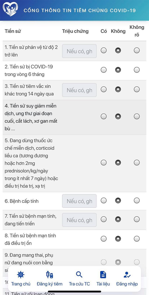 Bước 2: Nhập thông tin tiền sử bệnh: Lưu ý người dân cần khai báo đúng và đủ thông tin để đảm bảo tốt cho quá trình tiêm chủng.
