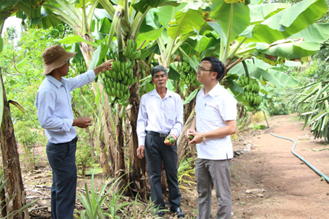 Người dân thôn Tân Phú (xã Ea Nuôl) giới thiệu về mô hình trồng cây ăn trái.