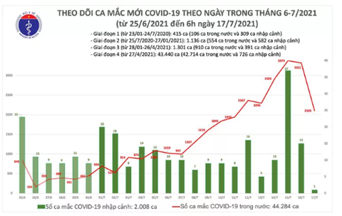 Đến sáng 17-7, Việt Nam có tổng cộng 46.292 ca mắc Covid-19. Trong đó, 44.284 ca ghi nhận trong nước và 2.008 ca nhập cảnh.