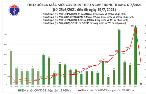 Bộ Y tế cho biết sáng nay 19-7, cả nước có thêm 2.015 ca mắc Covid-19. Việt Nam đã ghi nhận 55.845 ca bệnh. Gần 4,3 triệu liều vắc-xin Covid-19 đã được tiêm chủng.