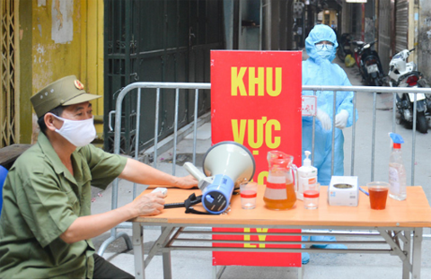 Lực lượng chức năng tạm phong tỏa một con ngõ trên phố Nguyễn Lương Bằng (quận Đống Đa, Hà Nội), nơi có ca mắc Covid-19 - Ảnh: Ngô Nhung
