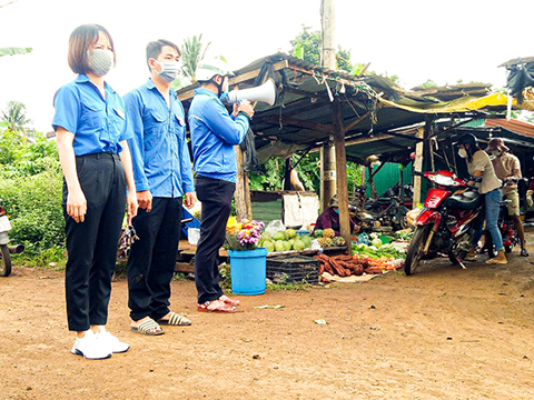 Đội hình thanh niên tình nguyện xã Ea M'nang tuyên truyền, vận động người dân thực hiện nghiêm các nội dung theo thông điệp 5K tại chợ Ea M'nang