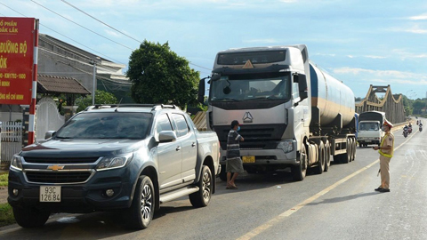 Lực lượng Cảnh sát giao thông Công an tỉnh tham gia kiểm soát phương tiện tại chốt kiểm soát dịch COVID-19 Quốc lộ 14 đoạn qua xã Hòa Phú, TP. Buôn Ma Thuột.