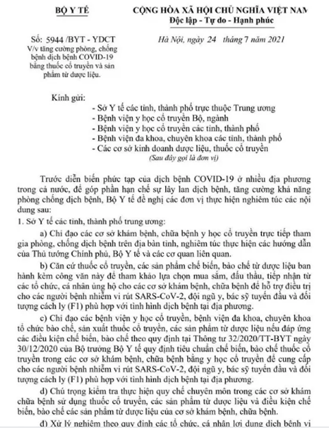 Theo đó, ngày 24-7, Bộ Y tế ban hành công văn số 5944/BYT-YDCT về việc tăng cường phòng, chống bệnh dịch bệnh Covid-19 bằng thuốc cổ truyền và sản phẩm từ dược liệu để góp phần phòng, chống dịch bệnh Covid-19. Tuy nhiên, do có một số nội dung chưa phù hợp nên Bộ Y tế thu hồi công văn này.