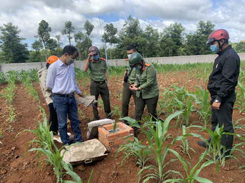 Đại diện chủ đầu tư và cơ quan công an kiểm tra một công trình giếng khoan nằm trong phạm vi lộ giới của dự án đoạn qua xã Ea Kao, TP. Buôn Ma Thuột. (Ảnh chụp trước thời điểm chưa áp dụng Chỉ thị 16 trên địa bàn TP. Buôn Ma Thuột).