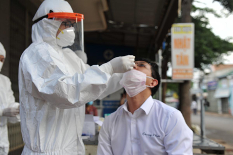Nhân viên y tế lấy mẫu xét nghiệm SARS-CoV-2 cho người dân ở đường Ama Jhao (TP. Buôn Ma Thuột).