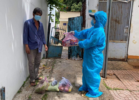 Thành viên Đội hỗ trợ mùa dịch Buôn Ma Thuột trao nhu yếu phẩm đến một trường hợp lao động tự do gặp khó khăn trong đợt giãn cách xã hội.