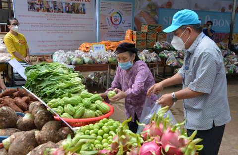Sáng 8-8, 200 suất nhu yếu phẩm được sắp xếp gọn gàng trên kệ theo từng gói tự chọn với nhiều mặt hàng như gạo, mì ăn liền, dầu ăn, nước mắm, trứng gà, nước rửa chén… Nhóm thực phẩm tươi cũng đa dạng không kém với cá nục tươi, thịt gà làm sạch, rau muống, su su, thanh long, khoai môn… Người lao động nghèo ở các phường Thống Nhất, Tân Tiến, Thành Công khi đến siêu thị sẽ được chọn lấy những phần nhu yếu phẩm mà gia đình đang thiếu cùng những thực phẩm tươi ngon để cải thiện bữa ăn trong mùa dịch.