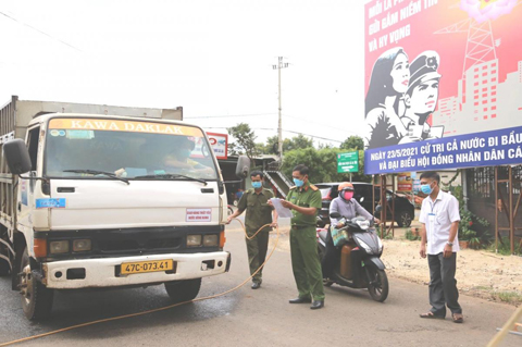 Công an xã Ea Tiêu (huyện Cư Kuin) kiểm tra giấy xét nghiệm COVID-19 đối với tài xế lái xe tải ra vào địa bàn. (Ảnh minh họa)