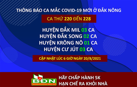 Từ 18h00’ ngày 19/8 đến 6h00’ ngày 20/8, tỉnh Đắk Nông ghi nhận 9 trường hợp mắc Covid-19, nâng tổng số trường hợp mắc trên địa bàn tỉnh lên 228 trường hợp.