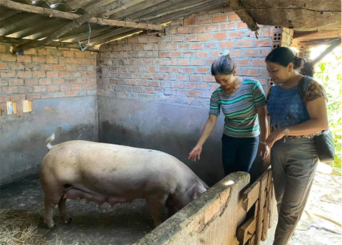Cán bộ Hội LHPN huyện Krông Pắc tham quan mô hình nuôi heo của chị Phan Thị Cam (bên trái).