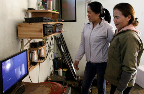 Chị Nguyễn Thị Hồng (bên phải) ở thôn Tân Sơn, xã Ea Knuếc theo dõi mật độ yến qua hệ thống camera giám sát.