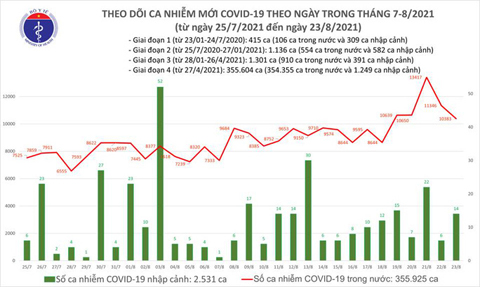 Bộ Y tế cho biết từ 18 giờ ngày 22-8 đến 18 giờ 30 ngày 23-8, trên Hệ thống Quốc gia quản lý ca bệnh Covid-19 ghi nhận 10.280 ca mắc Covid-19 mới, trong đó 14 ca nhập cảnh và 10.266 ca ghi nhận trong nước tại: TP HCM (4.251), Bình Dương (3.183), Đồng Nai (623), Tiền Giang (459), Long An (388), Bà Rịa - Vũng Tàu (154), Đà Nẵng (152), Đắk Lắk (128), Khánh Hòa (125), Nghệ An (111), Đồng Tháp (100), Cần Thơ (85), An Giang (75), Bến Tre (65), Kiên Giang (57), Phú Yên (43), Hà Nội (40), Bình Thuận (36), Trà Vinh (34), Sơn La (21), Bình Định (19), Tây Ninh (17), Thừa Thiên Huế (17), Bình Phước (13), Vĩnh Long (10), Bắc Giang (9), Quảng Nam (8 ), Đắk Nông (7), Ninh Bình (6), Quảng Bình (6), Gia Lai (5), Bạc Liêu (5), Hà Tĩnh (4), Ninh Thuận (4), Bắc Ninh (2), Thanh Hóa (1), Hà Nam (1), Lâm Đồng (1), Cà Mau (1). Trong đó có 6.021 ca trong cộng đồng.