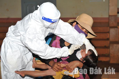 Lực lượng y tế lấy mẫu xét nghiệm SARS-CoV-2 cho người dân xã Cư Né (huyện Krông Búk).