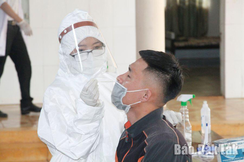 Nhân viên y tế lấy mẫu xét nghiệm SARS-CoV-2 cho người dân phường Tân Thành (TP. Buôn Ma Thuột).