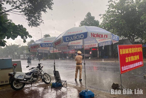 Lực lượng CSGT đang thực hiện nhiệm vụ tại một chốt kiểm soát dịch bệnh COVID-19 trên địa bàn thị trấn M'Drắk.