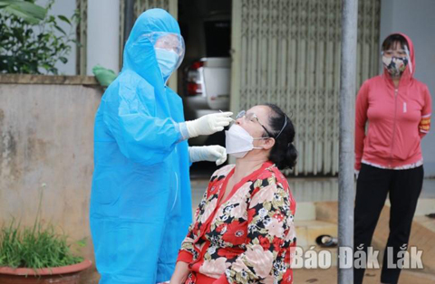 Nhân viên y tế tiến hành lấy mẫu test nhanh COVID-19 cho người dân xã Ea Ktur trong sáng 31-8-2021