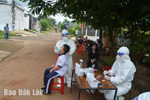 Lực lượng y tế lấy mẫu xét nghiệm chủ động cho Người dân xã Cư Êbur (TP. Buôn Ma Thuột) để sàng lọc F0 trong cộng đồng.