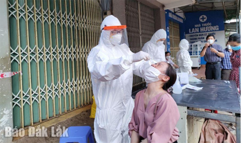 Nhân viên y tế lấy mẫu xét nghiệm SASR-CoV-2 cho người dân tại phường Tân Lập (TP. Buôn Ma Thuột).