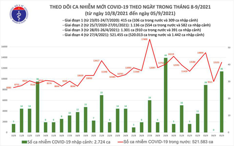 Bộ Y tế cho biết từ 17 giờ ngày 4-9 đến 17 giờ ngày 5-9, trên Hệ thống Quốc gia quản lý ca bệnh Covid-19 ghi nhận 13.137 ca mắc Covid-19. Trong đó có 36 ca nhập cảnh và 13.101 ca ghi nhận trong nước tại TP HCM (6.226), Bình Dương (3.540), Đồng Nai (1.243), Long An (756), Kiên Giang (345), Tiền Giang (133), Cần Thơ (100), Tây Ninh (91), Đồng Tháp (78), Khánh Hòa (74), An Giang (73), Đà Nẵng (64), Hà Nội (53), Bà Rịa - Vũng Tàu (51), Nghệ An (48), Bình Thuận (47), Trà Vinh (33), Quảng Ngãi (25), Phú Yên (24), Bình Phước (22), Vĩnh Long (20), Bình Định (13), Cà Mau (6), Lâm Đồng (5), Bến Tre (5), Bắc Ninh (5), Quảng Trị (4), Thanh Hóa (4), Lạng Sơn (3), Sơn La (2), Bạc Liêu (2), Ninh Thuận (1), Quảng Nam (1), Hà Tĩnh (1), Bắc Giang (1), Quảng Ninh (1), Đắk Nông (1). Có 7.521 ca phát hiện trong cộng đồng.