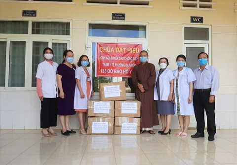 Ban trị sự chùa Đạt Hiếu tặng đồ bảo hộ cho Trạm Y tế phường Đạt Hiếu