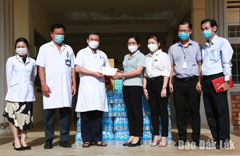 Dịp này, Đoàn công tác đã trao tặng mỗi đơn vị 10 triệu đồng tiền mặt cùng các trang thiết bị vật tư y tế và nhu yếu phẩm như: nước uống, sữa tươi, khẩu trang N95, kính chắn giọt bắn…