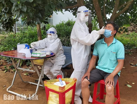 Lực lượng y tế lấy mẫu xét nghiệm SARS-CoV-2 đối với người dân có liên quan đến các F0 tại phường An Lạc, thị xã Buôn Hồ