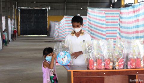 Thiếu nhi cách ly tập trung tại xã Ea Ning, huyện Cư Kuin nhận các phần quà Trung thu.
