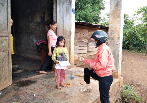 Giáo viên lớp 1 Trường Tiểu học Trần Cao Vân (xã Ea Sar) xuống buôn Xê Đăng giao bài và tặng đồ dùng học tập cho học sinh.