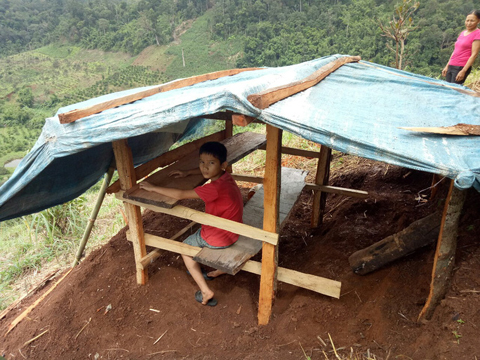 "Căn lều được dựng chủ yếu bằng thân cây tạp và phủ một lớp bạt đủ che nắng, che mưa; bên trong có một chiếc bàn nhỏ để cháu ngồi học khoảng 3 giờ mỗi ngày" - ông Hương cho biết.