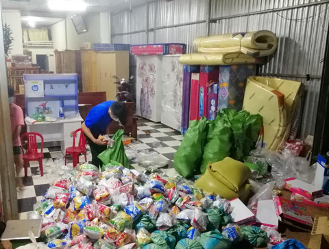 Thanh niên tình nguyện sắp xếp các phần quà để trao tặng các em thiếu nhi xã Dliê Yang