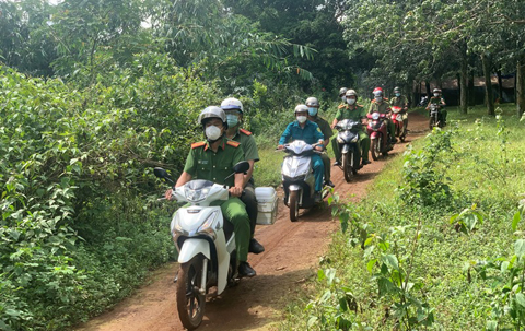 Lực lượng Công an xã Cư Bao trên đường tuần tra, kiểm soát an ninh trật tự trong các khu phong tỏa.
