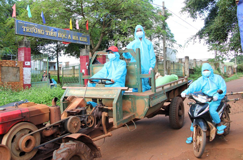 Thanh niên tình nguyện xã Cư Né (huyện Krông Búk) dùng xe cày vận chuyển nhu yếu phẩm hỗ trợ các hộ dân trong khu vực phong tỏa ở buôn Drao.