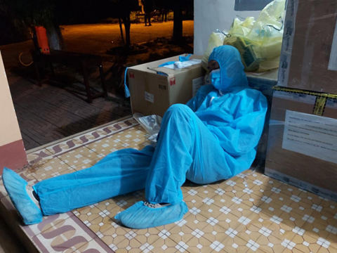 Phút nghỉ ngơi vội vàng của anh Vũ Hải Nam sau khi cùng đồng nghiệp thực hiện lấy mẫu cho hơn 1.000 công dân của tỉnh trở về từ vùng dịch các tỉnh phía Nam đêm 1-8-2021.