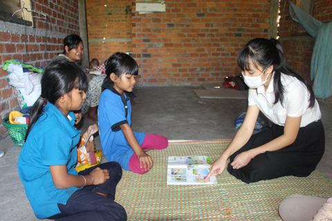 Cô Lê Thị Nga dạy học tại nhà cho em H’Hương Liêng (buôn Krang Kring)