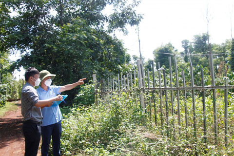 Đại diện chủ đầu tư và Công ty TNHH MTV Cà phê Việt Đức xác định vị trí đất thuộc diện thu hồi để triển khai Dự án đoạn qua thôn 9, xã Ea Ktur (huyện Cư Kuin).