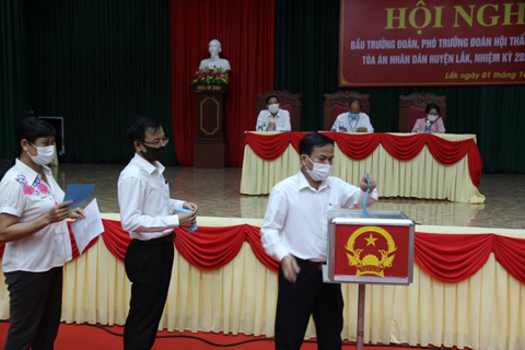 Các vị hội thẩm bỏ phiếu bầu Trưởng đoàn, Phó trưởng đoàn Hội thẩm nhân dân TAND huyện Lắk.