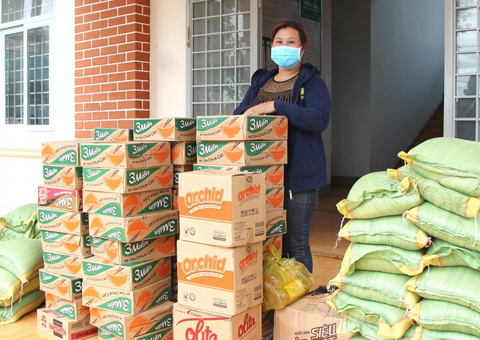 Một chiếc xe tải nhỏ đậu trước trụ sở UBND xã Cư Bao (thị xã Buôn Hồ), một nhóm người hối hả chuyển xuống những bao gạo, thùng mì tôm, nước mắm, dầu ăn.