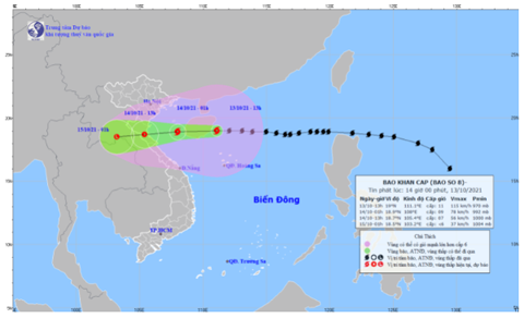 Đến 1h ngày 14/10, vị trí tâm bão ở khoảng 18,9 độ Vĩ Bắc; 108,0 độ Kinh Đông, cách Thanh Hóa khoảng 240 km, cách Nghệ An khoảng 250 km, cách Hà Tĩnh khoảng 190km. Sức gió mạnh nhất vùng gần tâm bão mạnh cấp 9 (75-90 km/giờ), giật cấp 11.