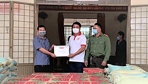 Doanh nhân Nguyễn Quang Vinh (ở giữa) tặng nhu yếu phẩm hỗ trợ người dân vùng phong tỏa, cách ly tại xã Ea Wy, huyện Ea H'leo.