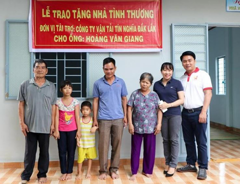 Doanh nhân Nguyễn Quang Vinh (bìa phải) bàn giao Nhà nhân ái tại huyện Buôn Đôn. (Ảnh chụp trước ngày 27-4)