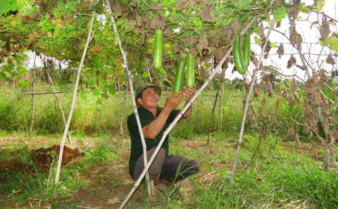 Cựu chiến binh Nguyễn Văn Tuấn thu hoạch bầu. Ảnh: T.Hải