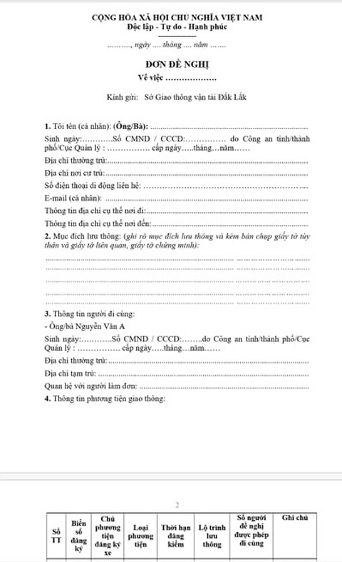 Mẫu đơn đề nghị ra vào tỉnh của Sở GTVT