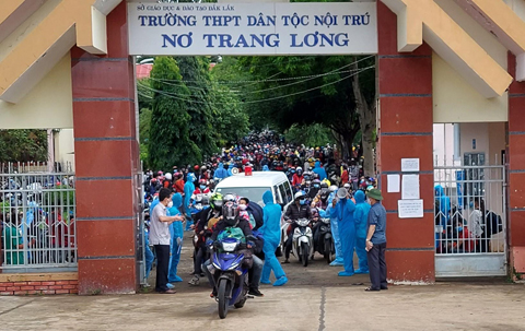 Công dân trở về từ các tỉnh phía Nam tập trung tại Trường Phổ thông Dân tộc nội trú Nơ Trang Lơng (TP. Buôn Ma Thuột) để xét nghiệm SARS-CoV-2.