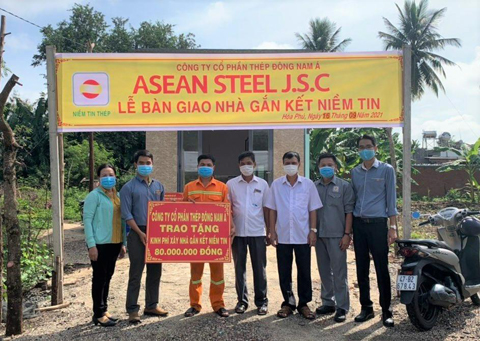 Đại diện Công ty Cổ phần Thép Đông Nam Á bàn giao Nhà gắn kết niềm tin tặng công nhân nghèo có hoàn cảnh khó khăn.
