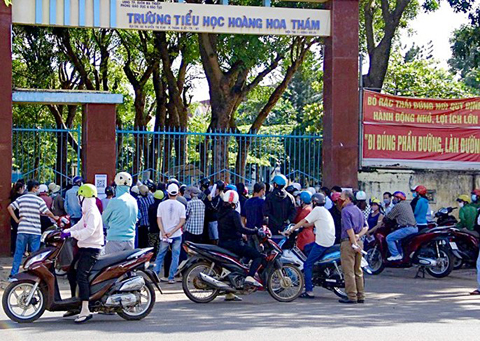 Rất đông người dân tập trung trước cổng Trường Tiểu học Hoàng Hoa Thám để tìm hiểu thông tin về tiêm vắc xin ngừa COVID-19