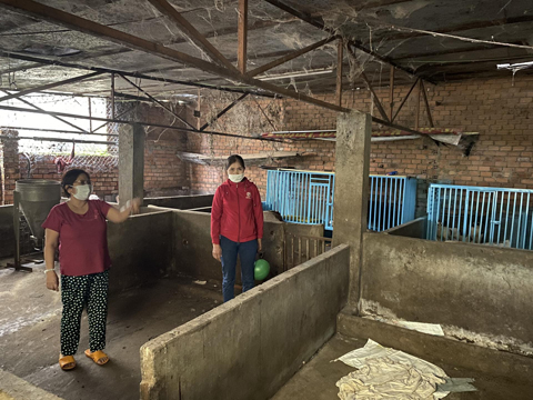 Bà Đinh Thị Mạnh (bên trái) trước chuồng trại trống không của gia đình